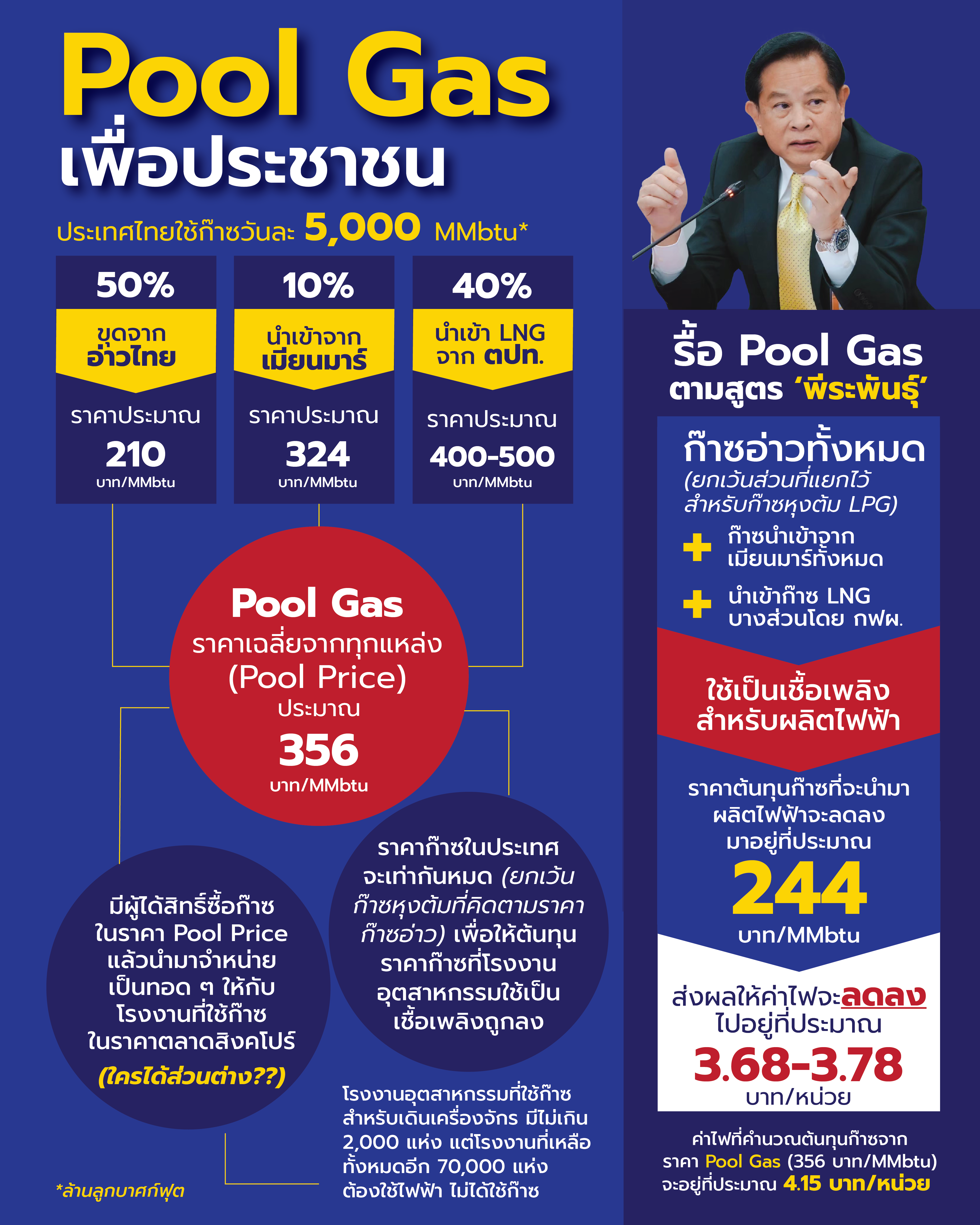 ในการบริหารจัดการค่าไฟฟ้า ‘พีระพันธุ์’ ได้แสวงหาช่องทางต่าง ๆ เพื่อลดต้นทุนการผลิตไฟฟ้า โดยเฉพาะในส่วนที่เกี่ยวข้องกับ ราคาก๊าซธรรมชาติ โดย ‘พีระพันธุ์’ ได้กำกับดูแลการบริหารจัดการแหล่งก๊าซธรรมชาติในอ่าวไทยให้ดำเนินการได้ตามแผน และบริหารจัดการให้โรงแยกก๊าซธรรมชาติใช้ราคา Pool Gas หรือราคาเฉลี่ยจากทุกแหล่งที่มา ทำให้ต้นทุนในการผลิตไฟฟ้าลดลง และส่งผลให้ค่าไฟฟ้าของประชาชนลดลง พร้อมเสนอแนวคิดในการรื้อระบบ Pool Gas เพื่อลดภาระค่าไฟฟ้าให้พี่น้องประชาชน โดยการปรับสูตร Pool Gas ตามแนวทางของ‘พีระพันธุ์’ จะทำให้ต้นทุนค่าก๊าซที่จะนำมาเป็นเชื้อเพลิงในการผลิตไฟฟ้าลดลงเหลือประมาณ 244 บาทต่อ MMbtu (ล้านลูกบาศก์ฟุต) ซึ่งจะส่งผลให้ค่าไฟลดลงมาอยู่ที่ประมาณ 3.68-3.78 บาทต่อหน่วย