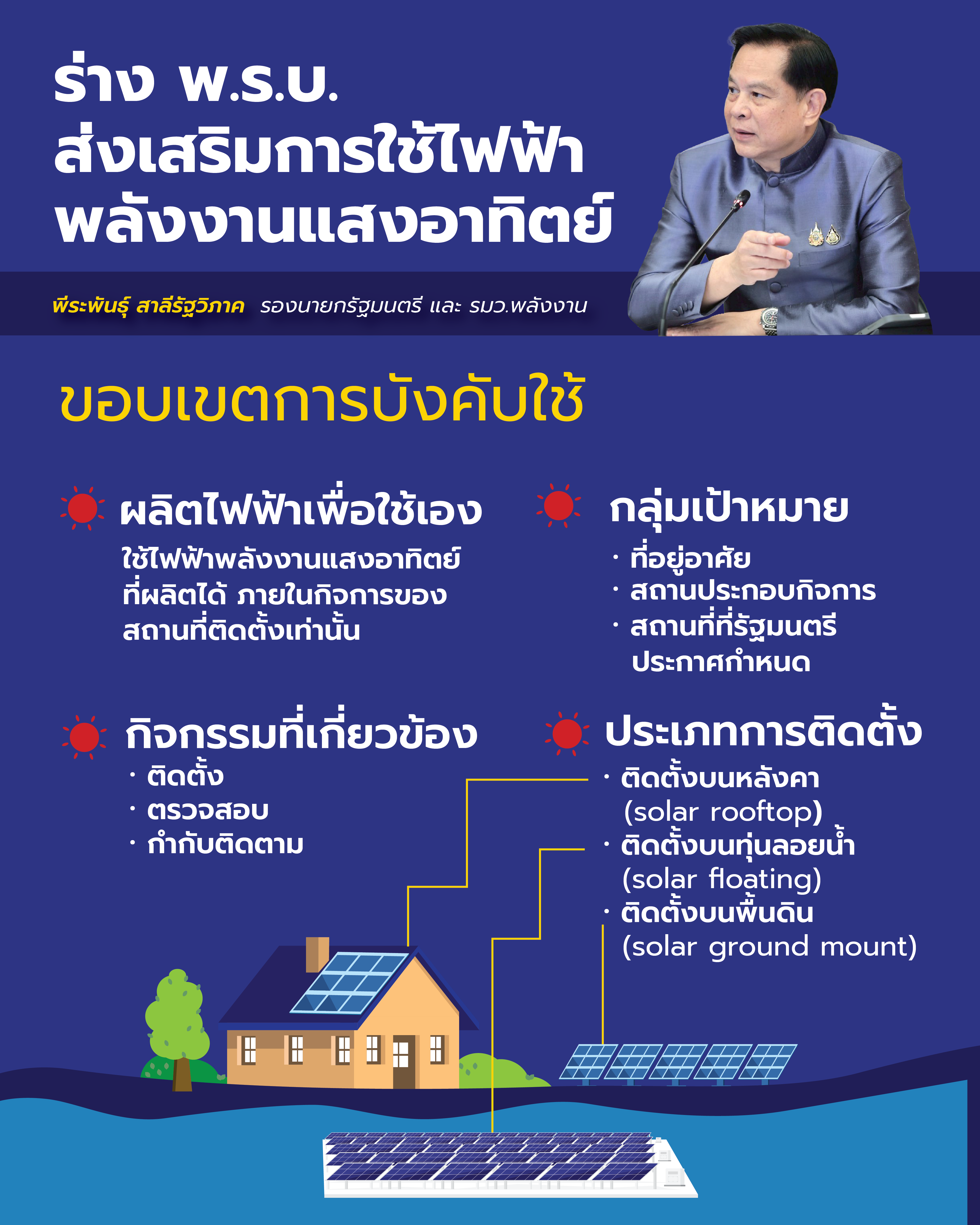 ร่าง พ.ร.บ. ฉบับนี้มีบทบัญญัติที่กำหนดไว้เป็นการเฉพาะเกี่ยวกับระเบียบและหลักเกณฑ์ในการติดตั้งอุปกรณ์ระบบพลังงานแสงอาทิตย์สำหรับผลิตไฟใช้เอง ซึ่งได้แก่ การติดตั้งบนหลังคา (solar rooftop) การติดตั้งบนทุ่นลอยน้ำ (solar floating) และการติดตั้งบนพื้นดิน (solar ground mount) รวมถึงหลักเกณฑ์ในการตรวจสอบและกำกับติดตาม โดยจะบังคับใช้กับสถานที่อยู่อาศัย สถานประกอบกิจการ และสถานที่ประกาศกำหนดโดยรัฐมนตรีกระทรวงพลังงาน