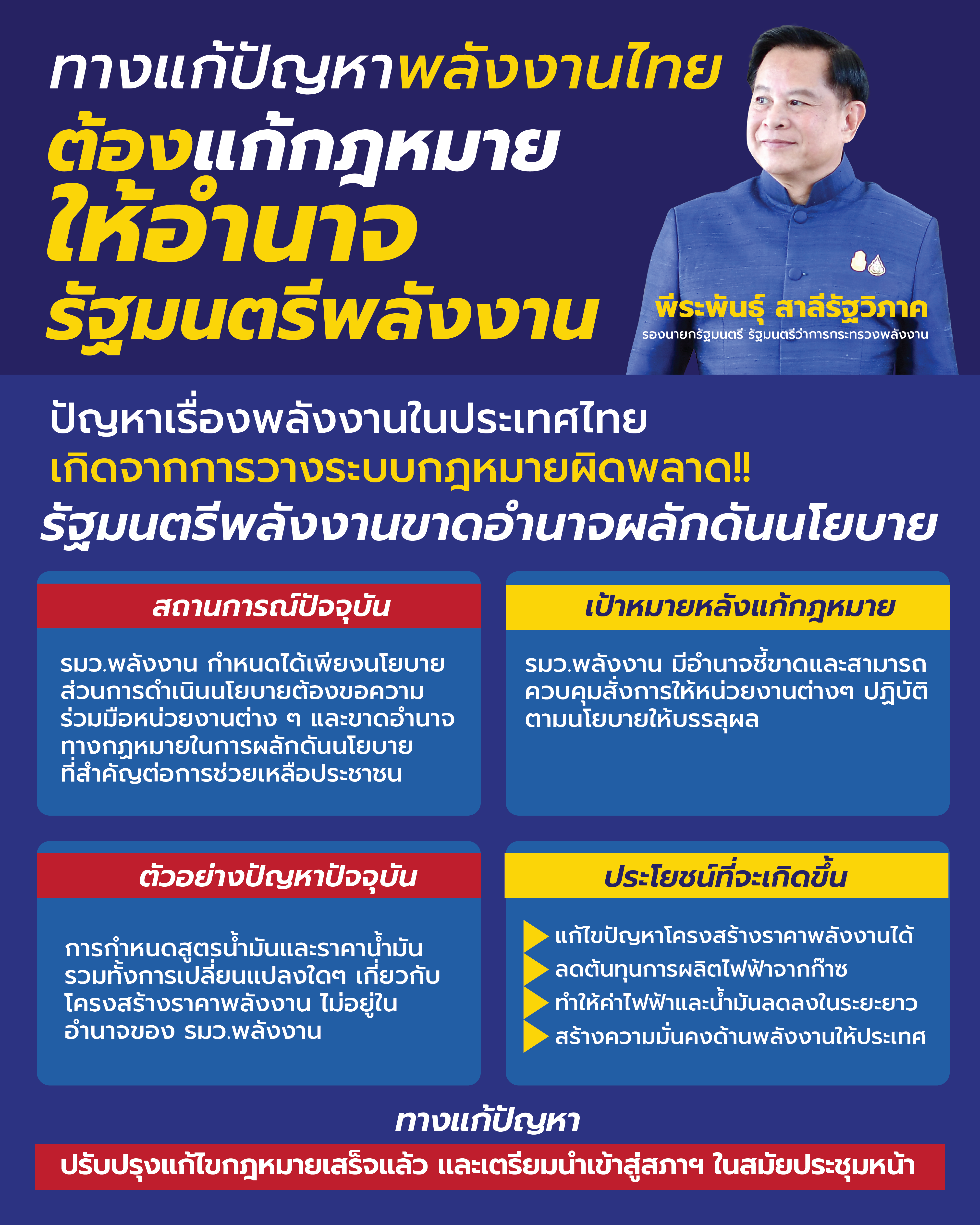 ในฐานะรัฐมนตรีว่าการกระทรวงพลังงาน ‘พีระพันธุ์’ ได้เร่งเดินหน้าขับเคลื่อนนโยบายด้านพลังงานภายใต้แนวทาง ‘รื้อ–ลด–ปลด–สร้าง’ โดยมีเป้าหมายเพื่อช่วยเหลือและลดภาระค่าใช้จ่ายด้านพลังงานให้กับพี่น้องประชาชน ทั้งในระยะสั้น ระยะกลาง และระยะยาว ด้วยการบริหารจัดการและกำกับดูแลหน่วยงานที่เกี่ยวข้องอย่างเหมาะสม การปรับปรุงแก้ไขระเบียบและกฎหมายด้านพลังงานที่ใช้มานานเพื่อประโยชน์สูงสุดของประชาชน การรื้อโครงสร้างระบบราคาน้ำมันเชื้อเพลิงให้มีความโปร่งใสและเป็นธรรมต่อทุกฝ่าย การสร้างรากฐานระบบพลังงานของไทยให้มีความมั่นคงอย่างยั่งยืน รวมถึงการส่งเสริมการใช้พลังงานสะอาดเพื่อเพิ่มเสถียรภาพและสร้างความสมดุลในระบบพลังงานของประเทศ