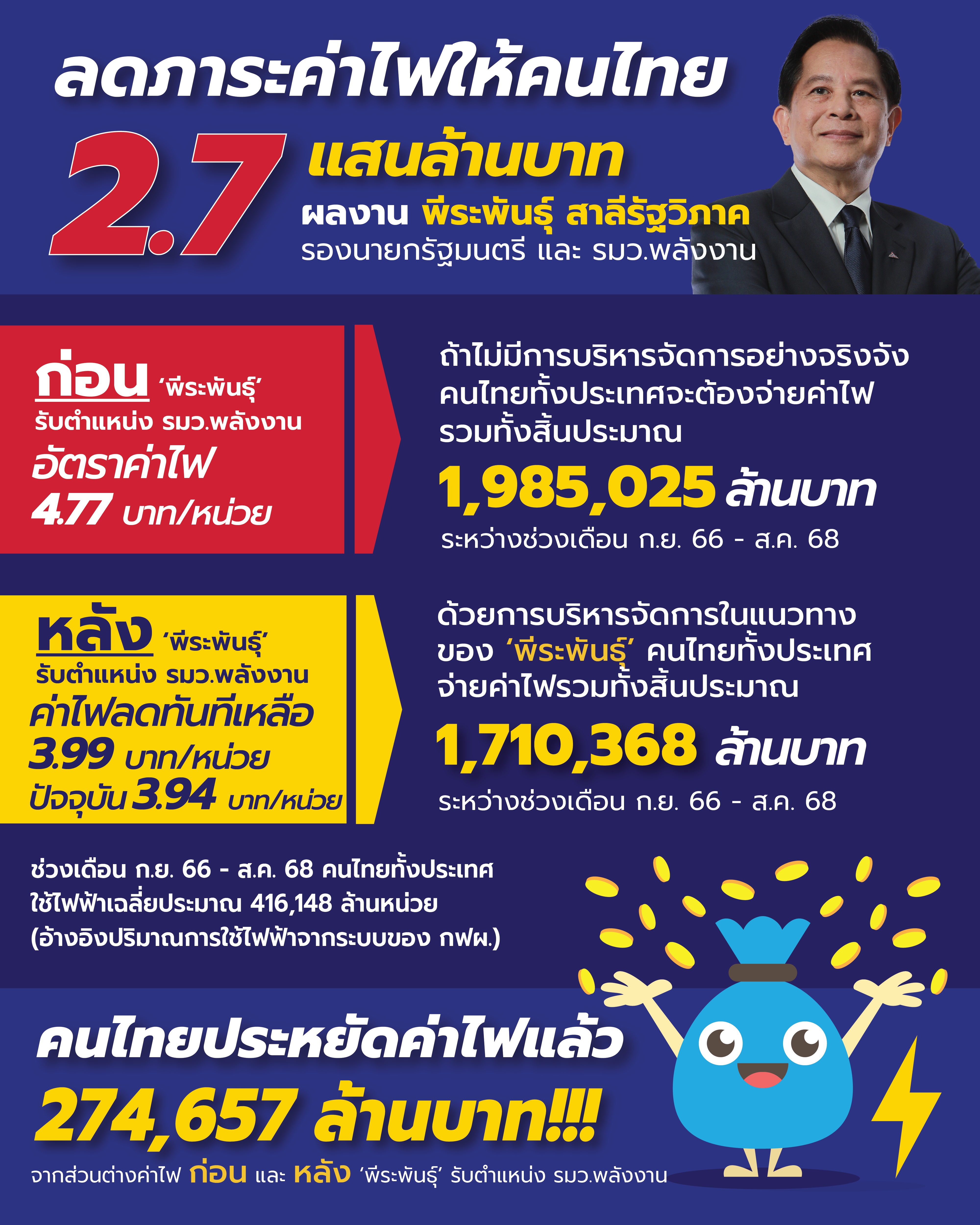 แนวทางบริหารค่าไฟของ ‘พีระพันธุ์’ ได้ช่วยให้ประชาชนประหยัดเงินการจ่ายค่าไฟระหว่างช่วงเดือนกันยายน 2566 - สิงหาคม 2568 รวมกันทั้งประเทศกว่า 2.7 แสนล้านบาท เมื่อเปรียบเทียบกับแนวทางของคณะกรรมการกำกับกิจการพลังงาน (กกพ.) ที่เสนอให้ปรับขึ้นค่าไฟไปถึงหน่วยละ 4.77 บาท